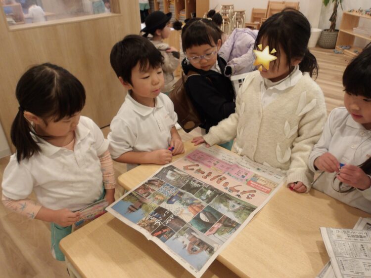 新聞紙を使って制作をしようとすると、ジブリパークのページを見つけて、思わず見入る子どもたち。