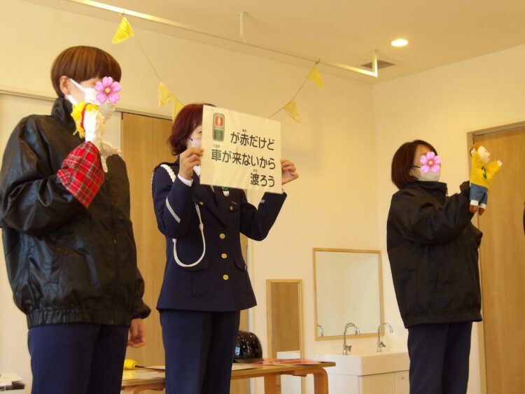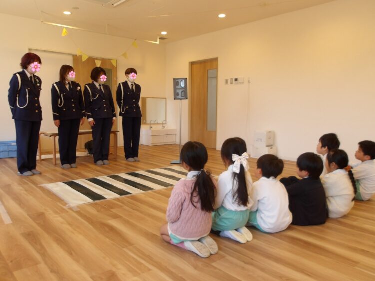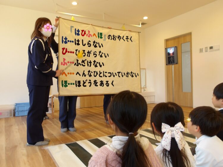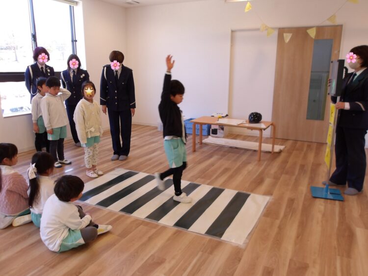 4月から小学生になるたいよう組に向けて、小学校の交通指導員による交通安全教室がありました。
