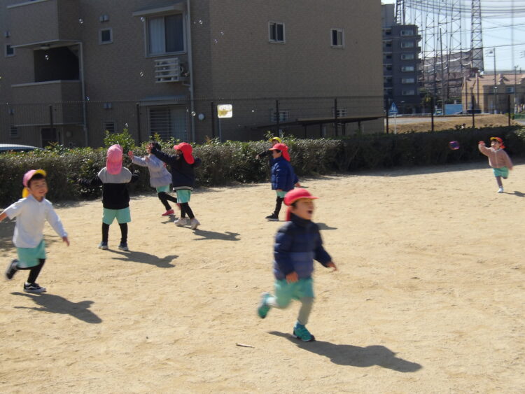 シャボン玉を始めると、「100個触れた!」「僕1000個!」と触る事ができた数を数えながら一生懸命追いかけていました。