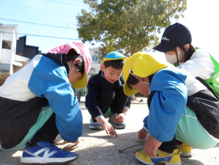 「ここが秘密の抜け道なんだ!見ててよ」と教えてもらい、興味津々で見つめる姿もありました。いつもと同じ公園でも、普段と全く違う遊び方に、みんな発見があったようですね。