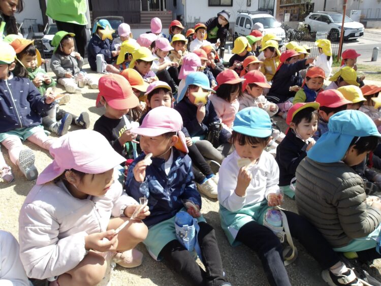 さいごはみんなで、丘の上でおせんべいを食べましたよ!みんなで食べるおやつ、おいしいね。