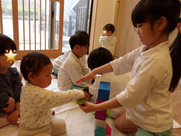 今日は乳児クラスのお部屋に年長たいよう組さんが来て、一緒にあそんでくれましたよ。