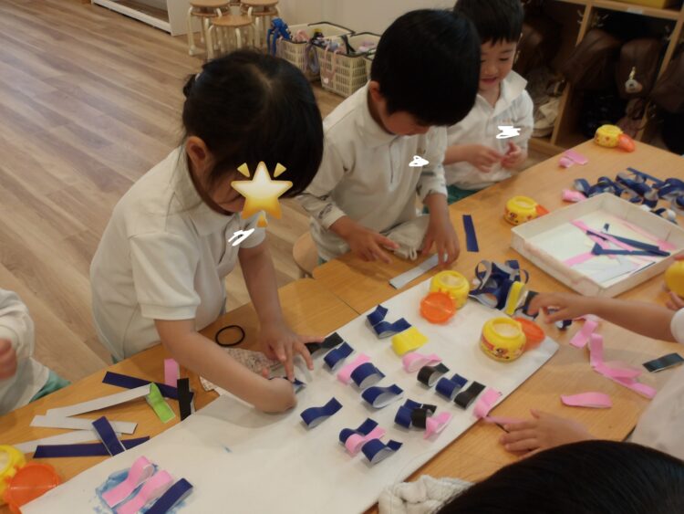 「お父さんは暗い色!お母さんはピンクにする!」など子どもたちで話し合い、こいのぼりを作っていきました!