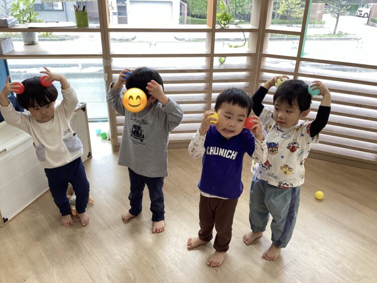 ボールをほっぺにつけて「アンパンマン!」頭につけて「みっきー!」となりきりごっこをしていました。かわいいですね🥰