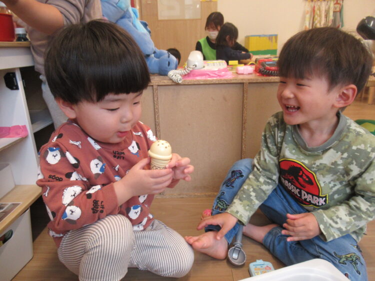 塩釜口(2~3歳)ホーム > 園のブログ > 🐿お部屋であそんだよ🐿🐿お部屋であそんだよ🐿2026.4.7今日もおやつを食べて一日がスタート⭐雨が降りそうだったので、お部屋でゆっくりすごしました🍁 電車をしたりアイス屋さんごっこをしたりシール貼りを楽しんだり😊それぞれ好きな遊びを見つけて楽しんでいました🍁前の記事