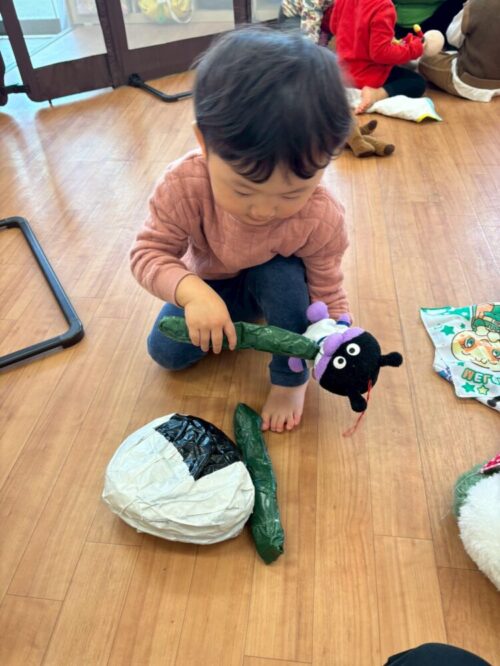 赤ちゃんぬいぐるみに、お野菜を食べさせてあげたり