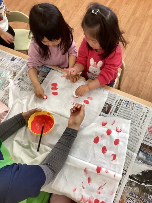 花びらの形をしたスポンジを赤い絵の具につけて