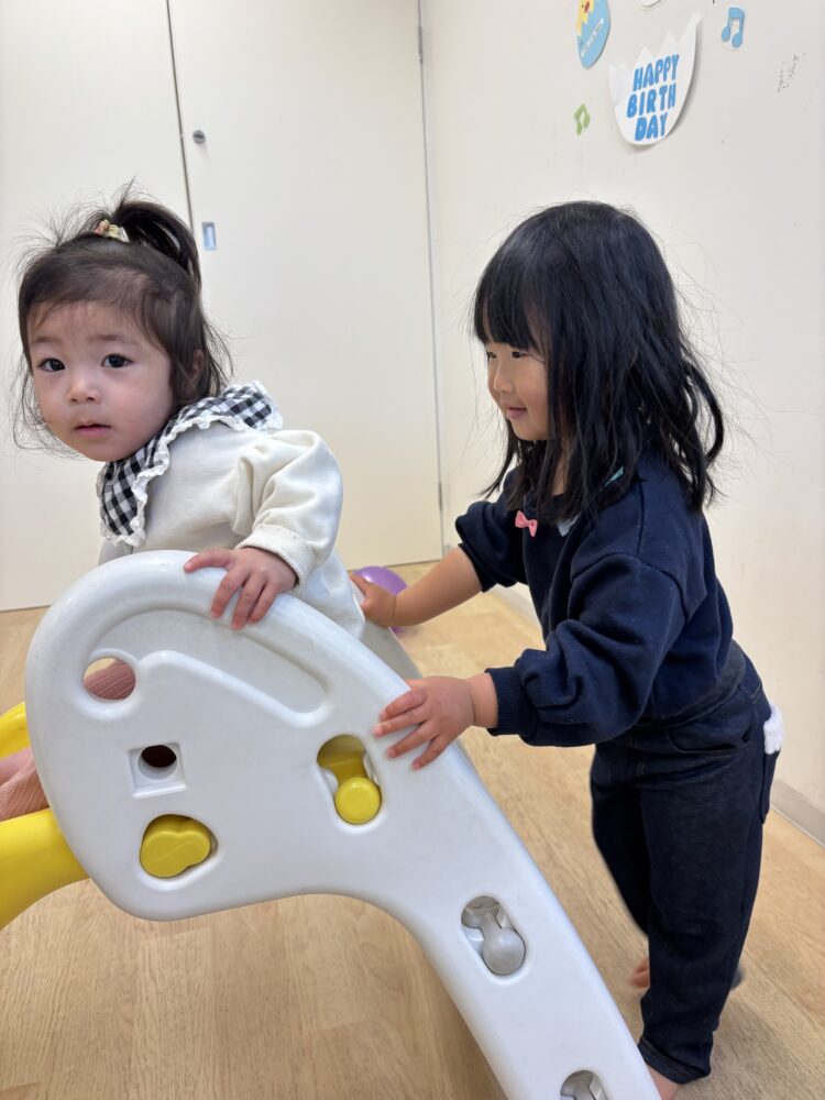 お友だちがパンダに乗っていると「押してあげる‼️」と優しいひよこ組さん🐥ニコニコ笑顔で揺られていました🐼
