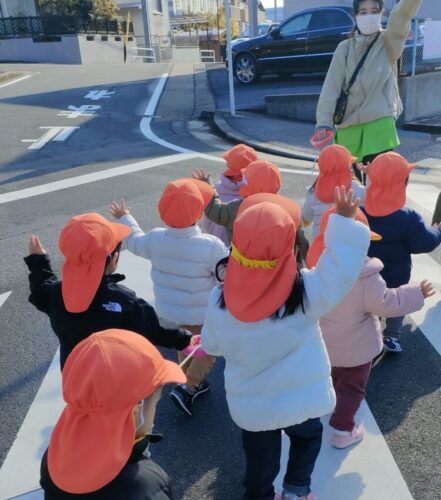 今日は朝からみんなで「寒いね❄️雪が降ってたね」とお話ししながら園周辺をお散歩しました🚶道端に「お花に雪が残ってるね〜🌼」おひさまが出てくると「ポカポカしてきたね☀️」とたくさんお話ししながら、横断歩道もみんなでカッコよく手を上げます🖐️
