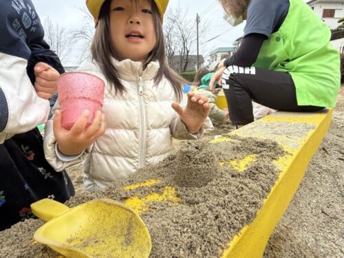 お砂場も大人気でした♪今日のお砂はフカフカして、ケーキ作り🎂やお弁当作りが大繁盛でした😊