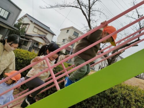 3人並んで順番にすべり台へ🛝転ばないように両手でしっかりと手すりを持ちます💪