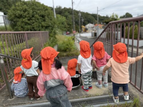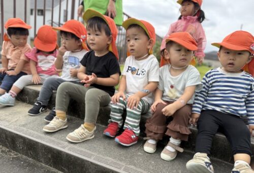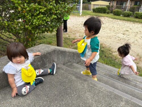 ぱんだ公園に到着し、さっそくいつもの階段でショベルカー観察です👀「黄色動いてるねー❗️」「お家無い無い‼️」と大興奮のあひる組🦆