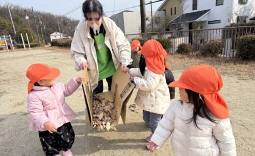 「寒いから卵あっためてあげよー」と保育者が伝えると、みんなで一緒に葉っぱ集めスタートです🍂ダンボールすべり台にたくさんの葉っぱを乗せて、卵の場所までみんなで運びます💪