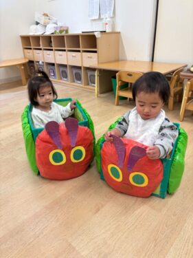 ひよこ組さんは室内遊びです🌈運動会で活躍したはらぺこあおむし号に乗って、楽しく遊ぶ2人組🐥