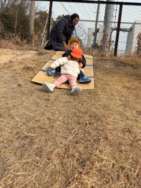 大好きなダンボールすべり台で遊ぶあひる組さん🦆今日も「一緒にすべろー‼️」とお友だちを誘って2人で仲良くすべっていました🛝