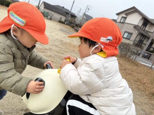 お友だちがパンダに乗っていると「押してあげる‼️」と優しいひよこ組さん🐥ニコニコ笑顔で揺られていました🐼