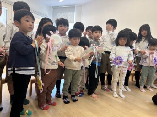 プレゼントはくま組さんがうさぎ組の頃の写真が貼ってあるメダルです🎖️ひよこあひる組が色紙を貼り、うさぎ組が花びらのテープを貼って製作したものでくま組も喜んでくれました🙌「小学校に行っても頑張ってね‼️」とみんなでご挨拶をしてお別れ会が終わりました✨