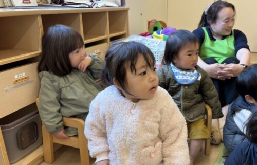 くま組さんの素敵な歌を真剣な表情で見守るみんな👀ひよこ組さんも手を叩いて歌の発表を楽しんでいましたよ👏