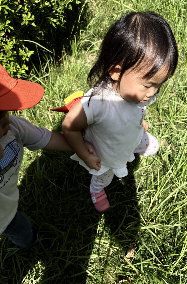 公園内の坂道を「一緒に手を繋ごう🖐️」とお友だちを誘って引っ張ってくれるお友だち👏