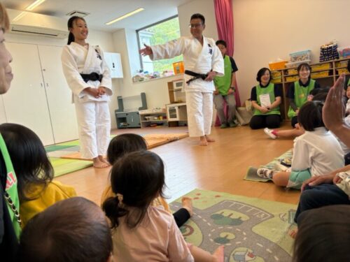 間近で見る柔道の技の数々を興味津々で見守るあひる組さん👀受け身の大きな音にびっくりして泣けてしまう子もいましたが、最後まできちんと座って見学することができました👏