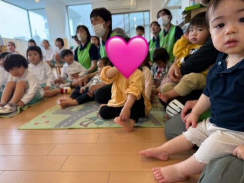 散歩から帰ったあとはくま組のお部屋にお引越しして見学会のスタートです✨初めてのことに緊張ぎみのあひる組さんでした🤭
