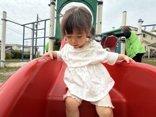 パンダ公園に到着すると1番にすべり台に向かうあひる組さんたち😊保育者の手を借りてはしごを登って、すべり台をシュー💨もう一回❗️とまたはしごに向かっていきました🤭