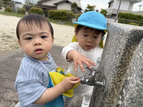 パンダ公園を探索して水飲み場にたどり着いたあひる組さんたち🦆興味津々な様子で蛇口を触っていました👀