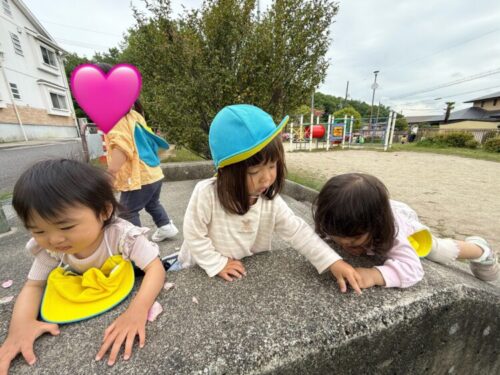 最後はみんなでダンゴムシ探しをしました🔍保育者が見つけたダンゴムシをどうぞと渡してあげると恐る恐る持ってみるあひる組さん😊逃げ出したダンゴムシを一生懸命捕まえようとする姿もありました✨