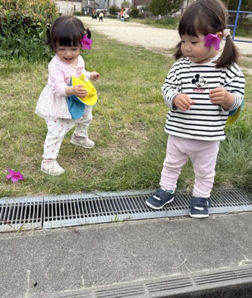 階段で座って道路を通る車やトラックを眺めているととても大きな羽アリがやってきました😳少し怖いかな?と思いきや、大はしゃぎのあひる組さん🤭そのまま指で捕まえて「見て〜‼️」と保育者に自慢していました😊