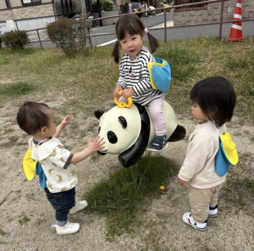工事のお兄さんたちにバイバイをしたあと、無事に公園に到着です💪今日はパンダのスイング遊具が人気で、きちんと順番を守って楽しく遊ぶことができました🐼