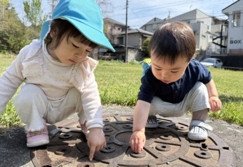 マンホールの下から水の流れる音が聞こえます👀なんの音だろう❓と気になるあひる組さん🦆穴の中に石や指を入れて調査をしていました🔍
