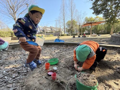 砂場で何を作っているかな?ナイショの作戦会議中です😌