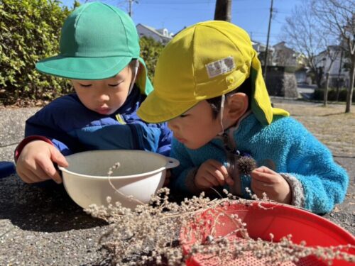 引き続き虫探しをするうさぎ組さん🐰ダンゴムシやゴミムシ、ヤスデなどお砂場セットの箱がいっぱいになるほど捕まえることができました👏