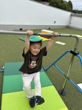今度はミノムシになりきって鉄棒に挑戦です❗️体操教室の経験を活かして上手にぶらーん