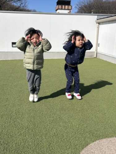 風が強く寒く感じましたが体を動かすと暑くなり上着を脱ぐ子もいました🎵