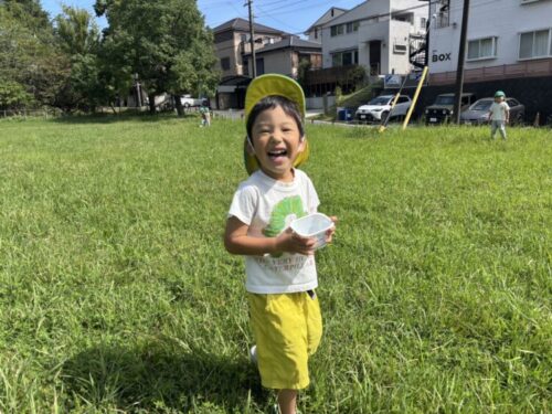 体操教室が終わったらさっそく裏山広場へ🙌カップを持って虫探しに出発です💨この時期はバッタがたくさんいるので飛んでいるところを見つけて捕まえます🦗