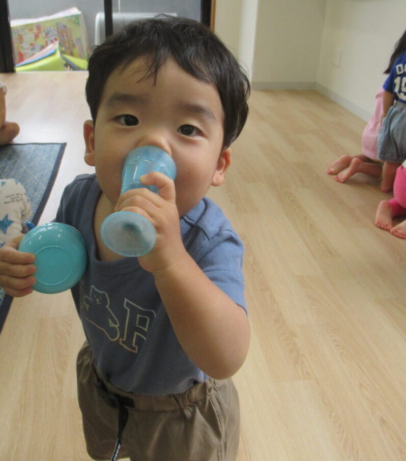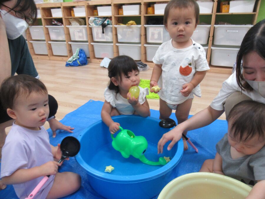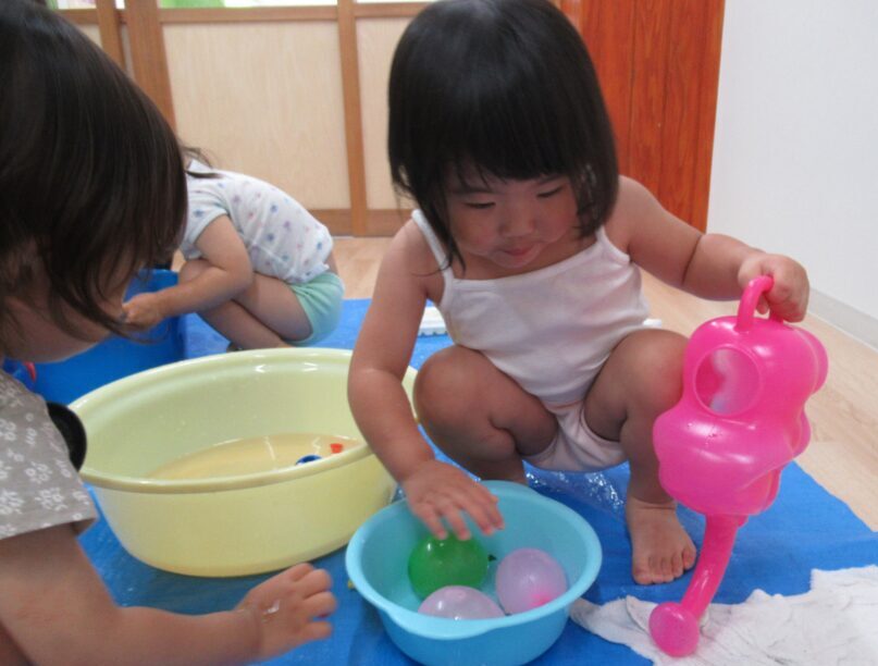 カップからカップに水を移しかえたり、ジョウロで水の動きを楽しんでいます。