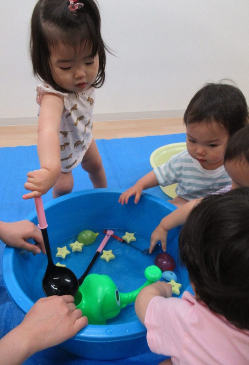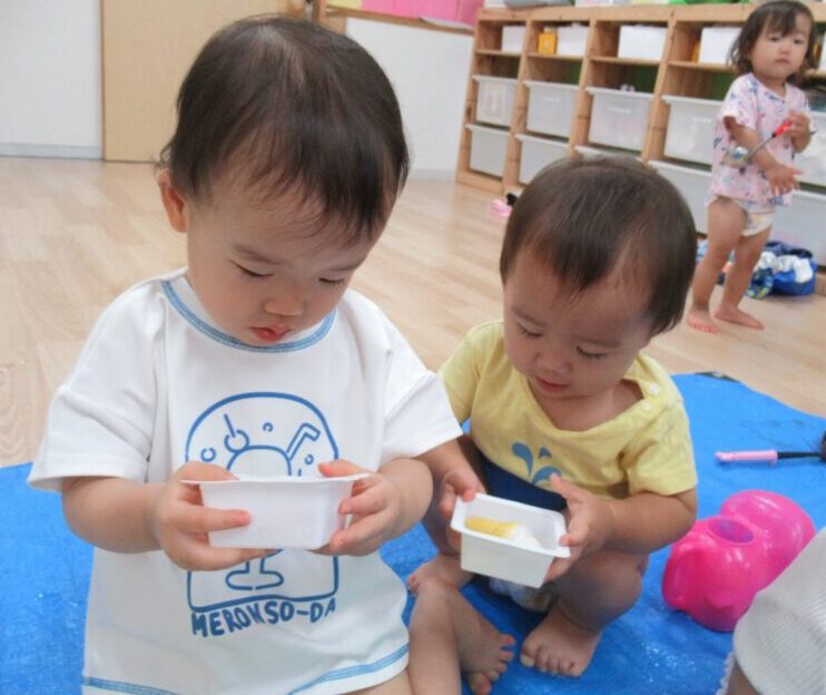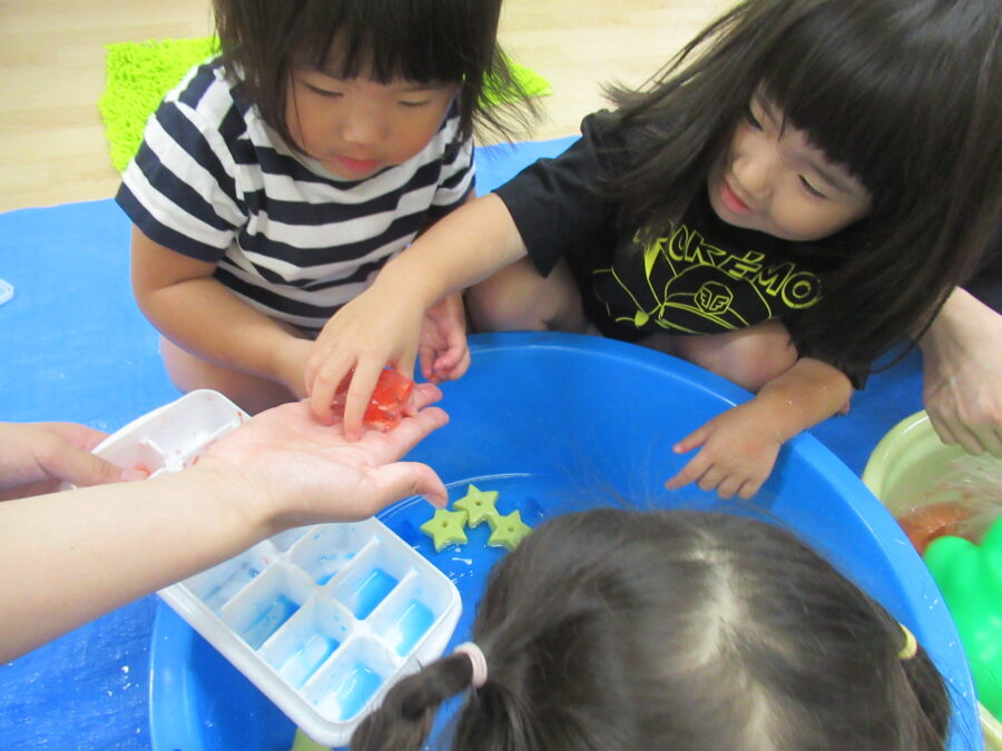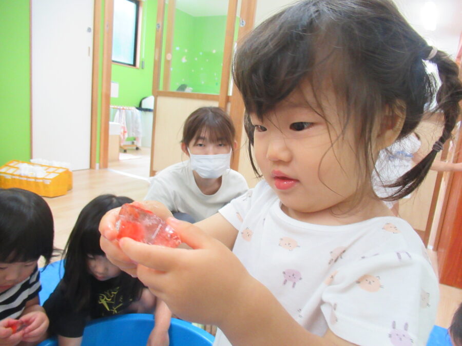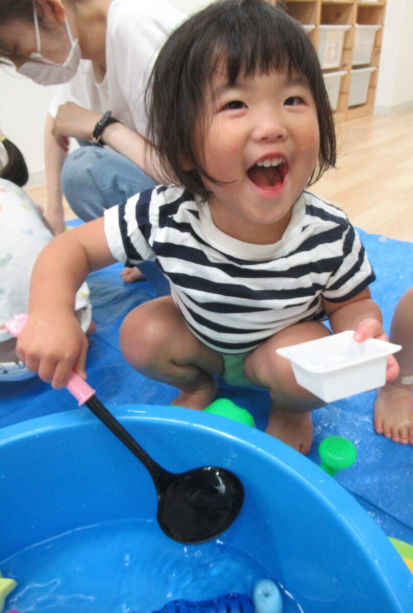 お玉やカップを持って、バケツに水や氷をいれて遊びます🤽‍♀️