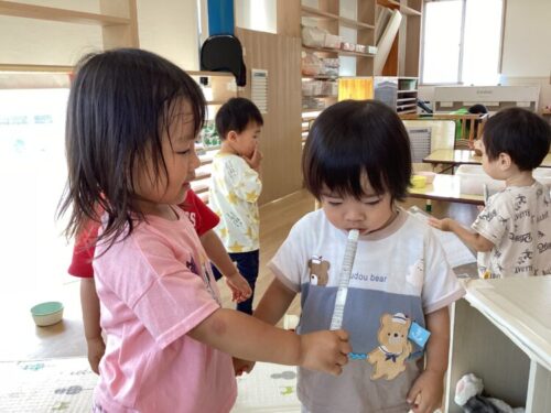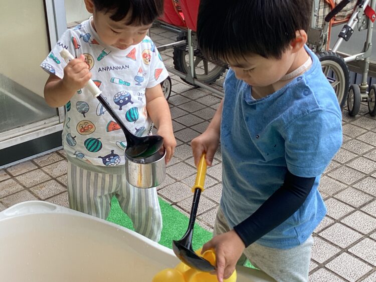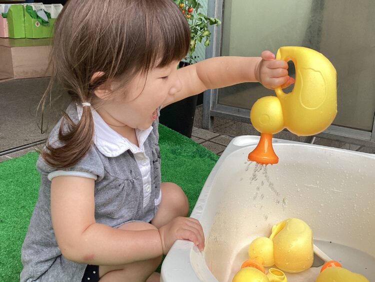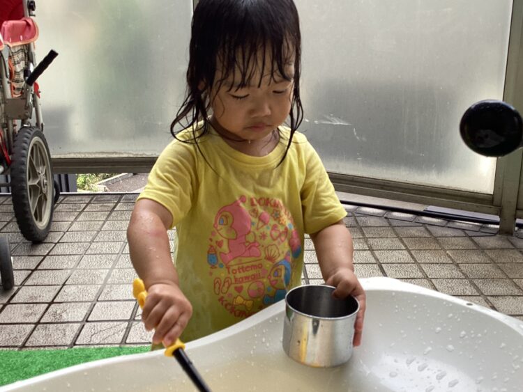勢いよく水が流れることが楽しくて、何度も水を入れて流すことを楽しむお友だちもいましたよ😄