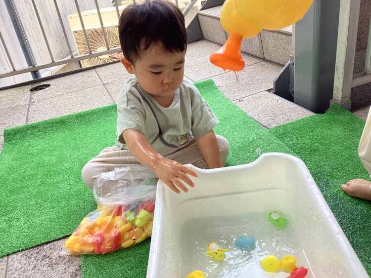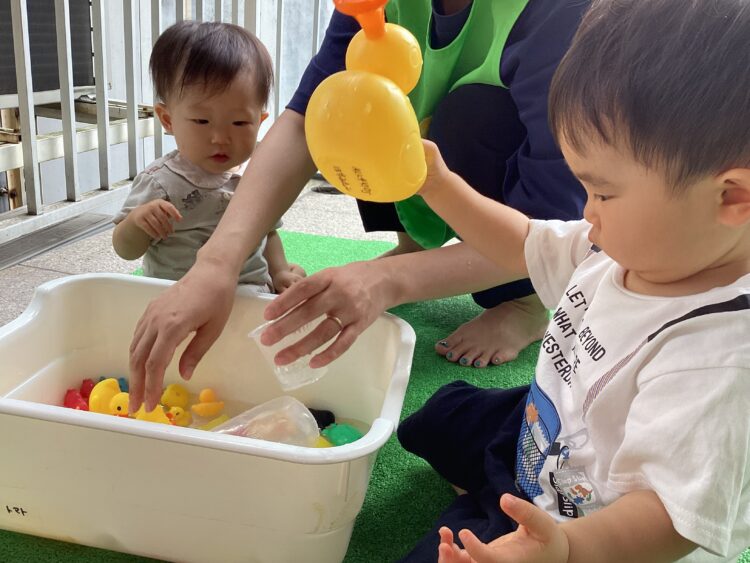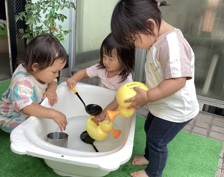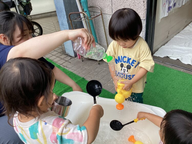 ひまわり組さんは遊び方ダイナミックになってきて、服がびしょ濡れになる程、水に触れることを喜んでいました🙌