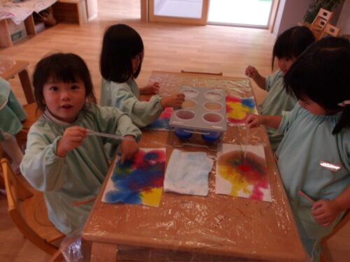 今日の製作コーナーでは、以前にやった際もっとやりたいとの声があったので、にじみ絵を取り入れた保育をしました。