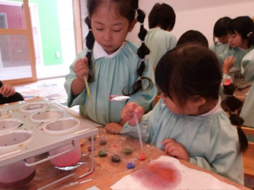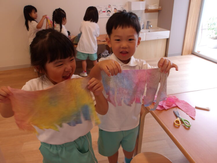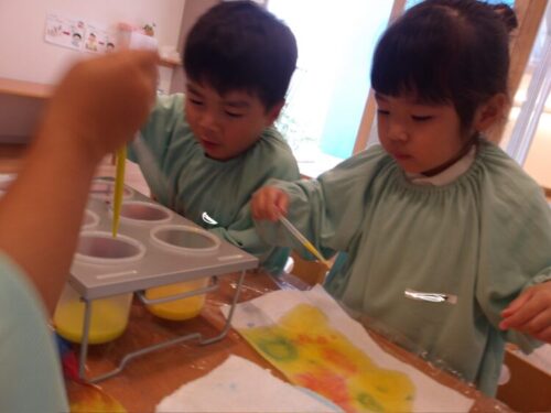 赤と青と黄色の色を取り入れたので、色を混ぜて赤と黄色でオレンジになった!紫になった!と色作りも楽しんでやっていました😄