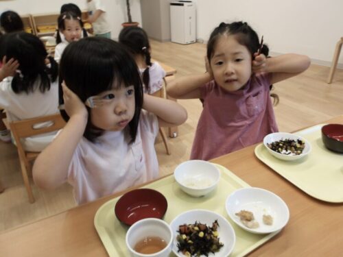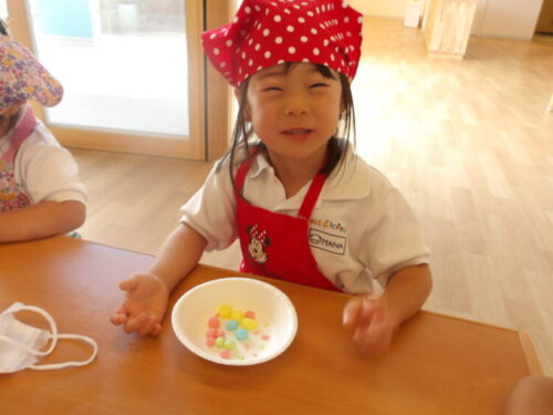 終わった後の自由遊びでは、おままごとで花ビーズをラムネに見立ててアイスにトッピングして遊んでいましたよ☺️