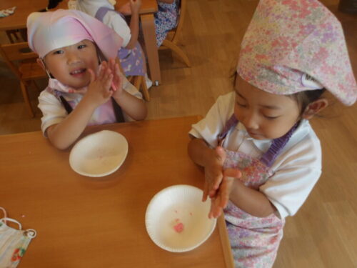 今回はかき氷シロップで四種類の味付けをして、自分たちで丸めて作りました😄