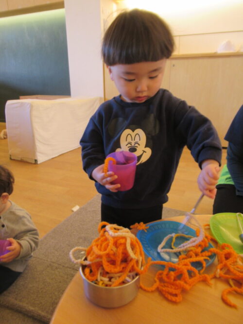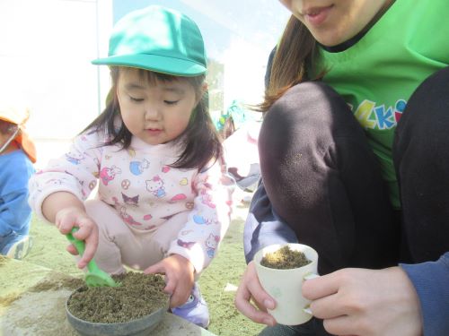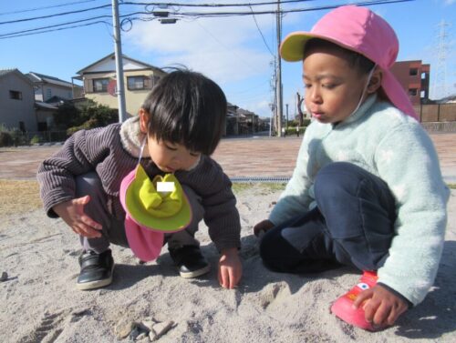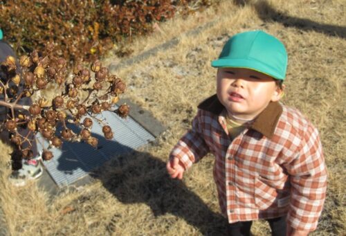 公園の隅っこにはたくさんの木の枝が落ちていて、それぞれ気になる木の枝を拾って、、地面をツンツン。地面をよく見たら、、木の実を発見!!👀