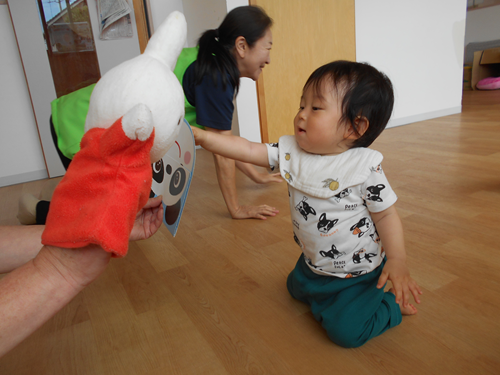 お部屋の端からパペットやペープサートを見せて