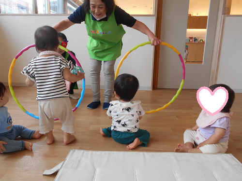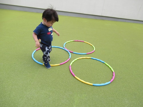 フラフープが三つ並んでいるのを見つけたお友だちは、三つのフラフープの中を順番に行ったり来たりして楽しんでいました☺