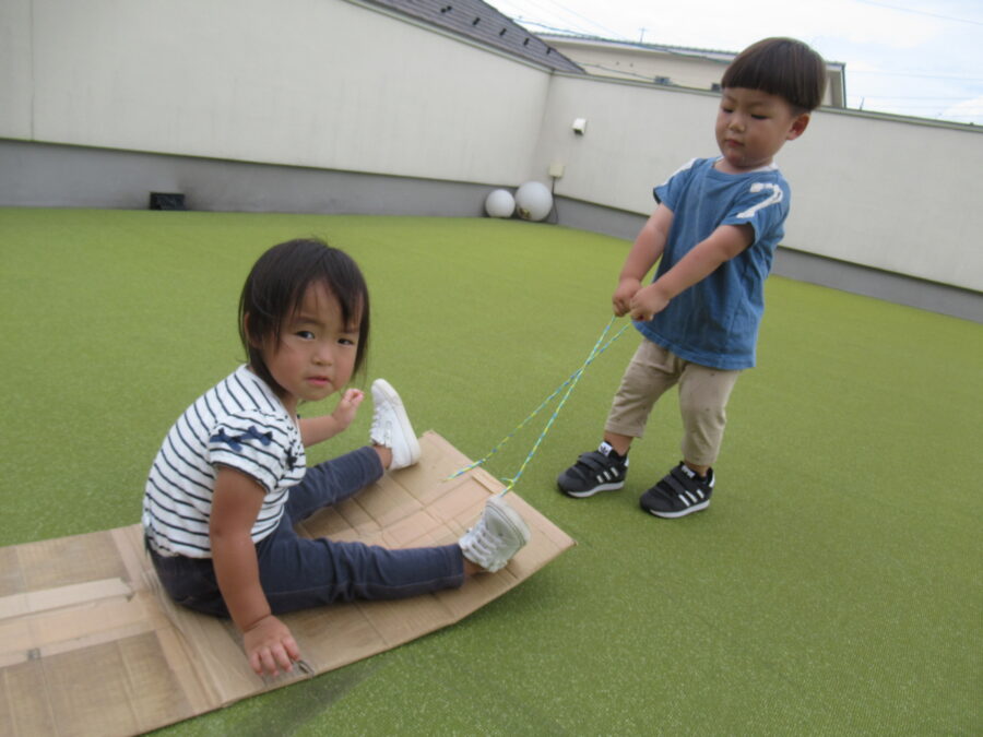 ソリに座って先生に引っ張ってもらうのはもちろん、先生の真似をして引っ張るのをやってみたいお友だちも🌟とっても楽しそう!