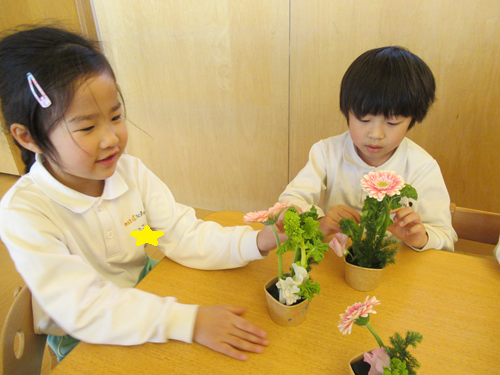 完成したお友だちは、グループのお友だちと完成したものを見せ合っていました「菜の花をガーベラの隣にしたよ」👀