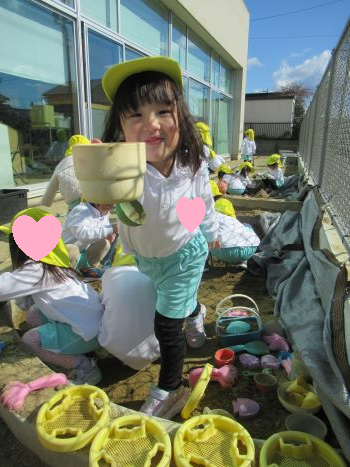 お友だちと大きなお山をつくり、おやまに可愛らしい飾り付けもしてとっても嬉しそうな笑顔を見せてくれました💗